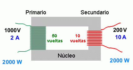 Ahora, debemos tener en cuenta que para mantener esa potencia constante en el primario y el secundario y con una tensión de salida inferior en el secundario, la intensidad de dicho secundario debe ser superior a la del primario.