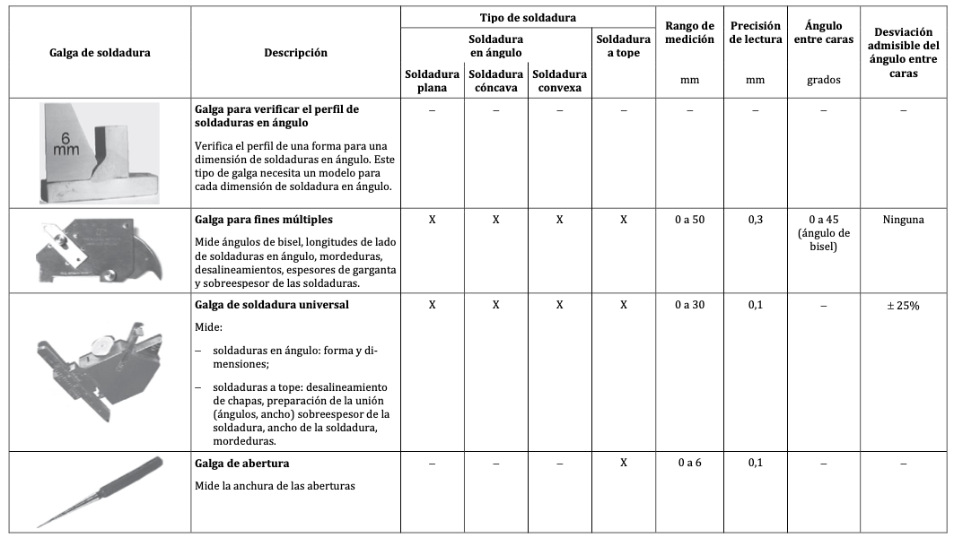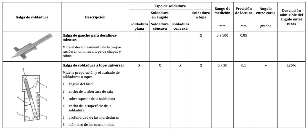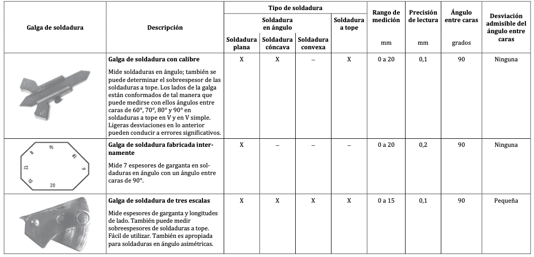 - Calibradores y galgas (para medir dimensiones como el tamaño del filete o el refuerzo).
