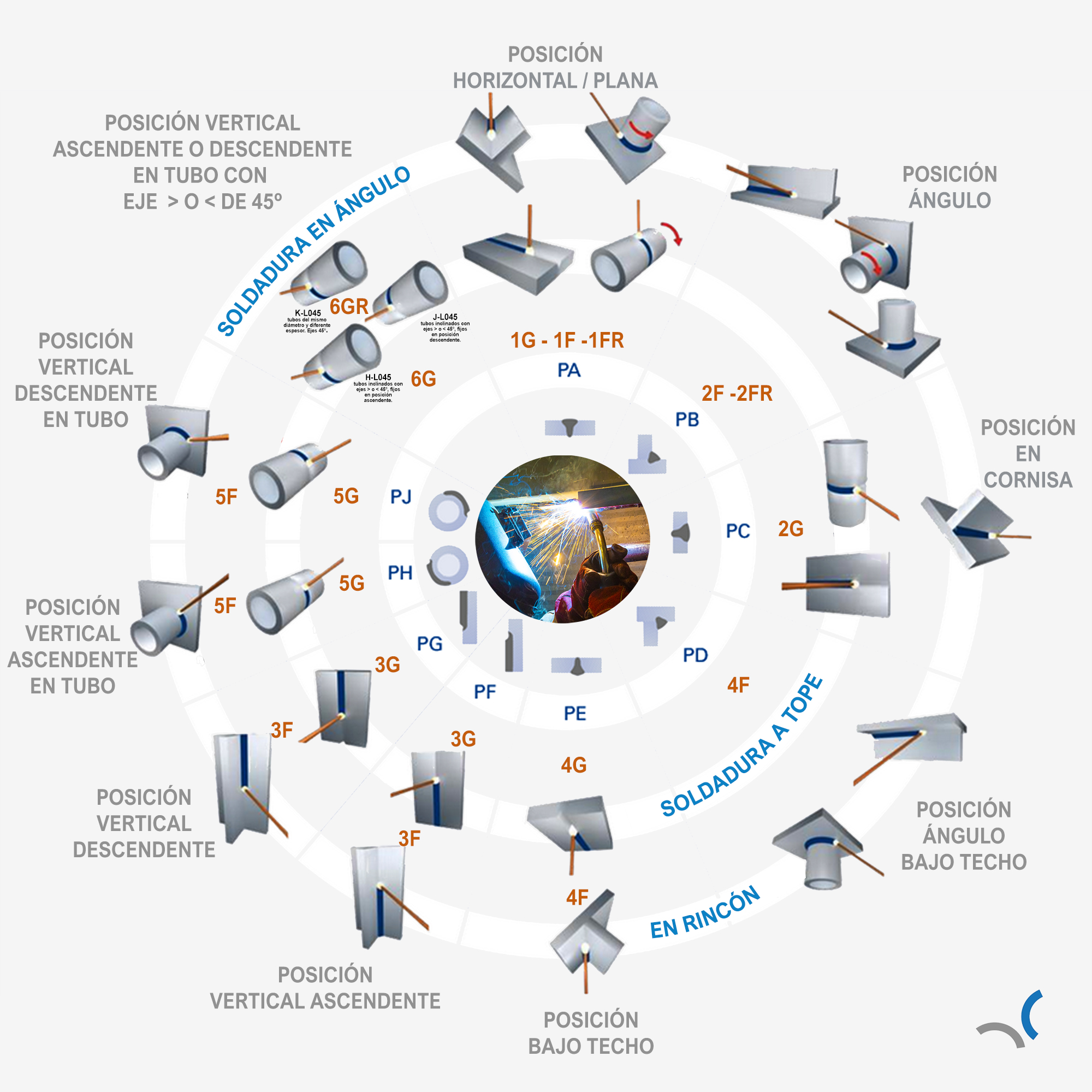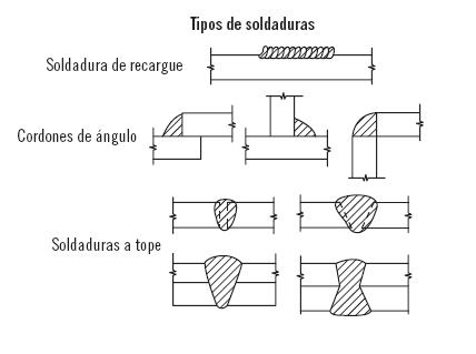 También tenemos distintos tipos de soldaduras, en función de si se realizan a tope o en ángulo interior (o exterior). Si consultamos nomenclatura americana veremos que la soldadura en ángulo la denominan filete y las posiciones de soldadura realizadas de esta forma se acompañan con la F. A su vez, las que se realizan a tope en las normas americanas las refieren con una G.