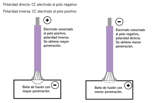 CC- (electrodo negativo): menor penetración, más adecuado para chapas delgadas. El calor se reparte 70% en la chapa y el 30% en el electrodo.