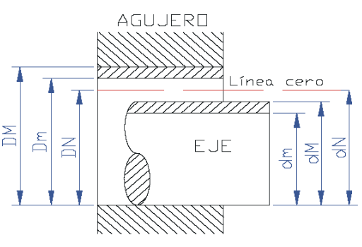 - Dimensiones límites: son los valores extremos que puede tomar la dimensión efectiva. Máxima en ejes dM, máxima en agujeros DM; mínima en ejes dm, mínima en agujeros Dm.
